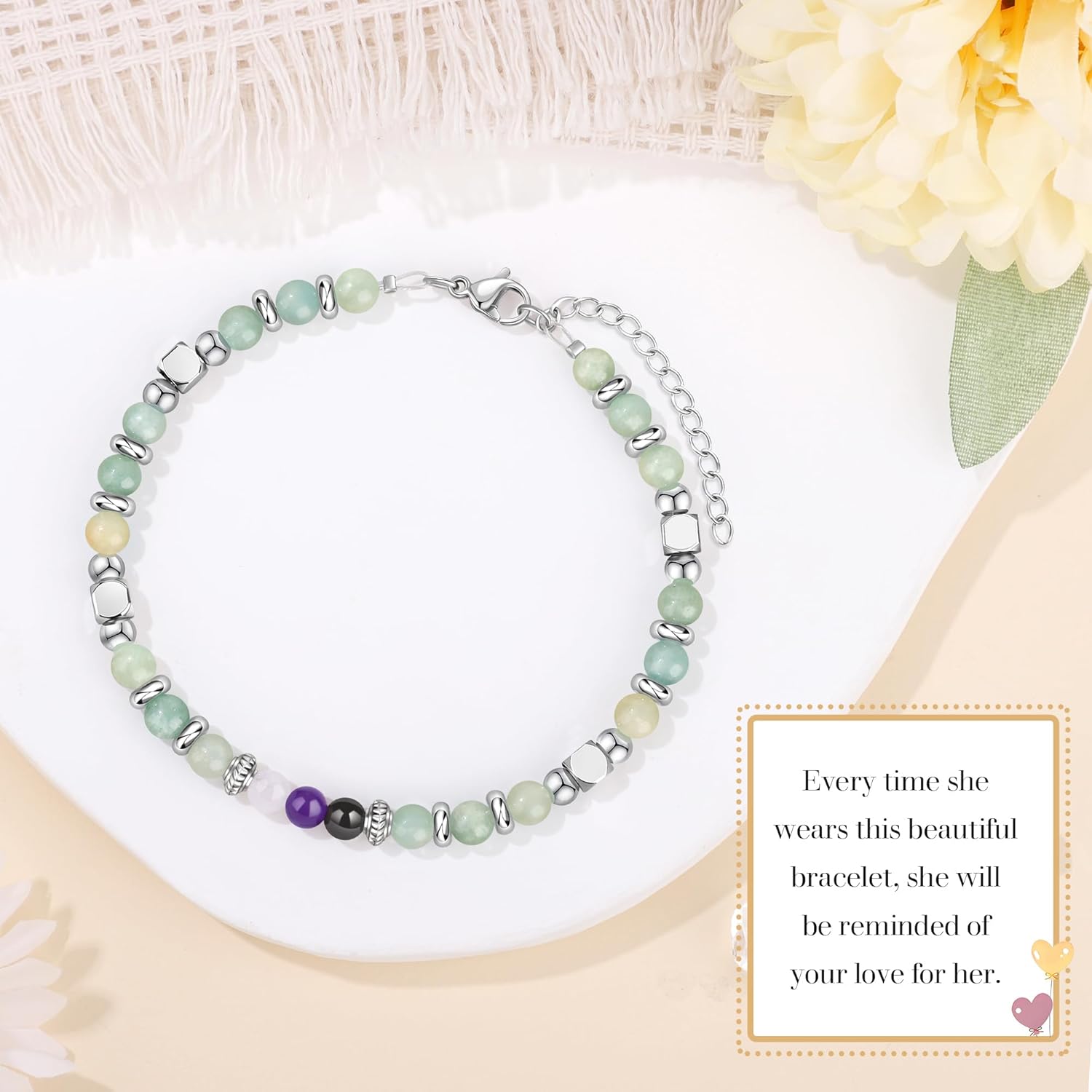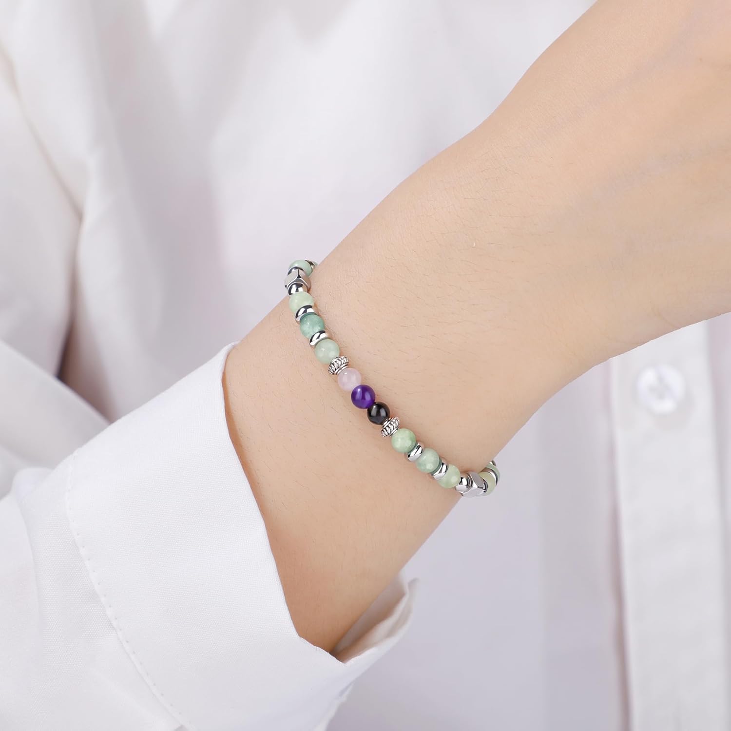 The bracelet is made of 4mm Amazonite and stainless steel beads, each natural stone has been carefully selected. The length of the beautiful bracelet is 7.0″ + 1.5″, it is adjustable with an extender chain, makes it easy to wear, and ensures a perfect fit for most wrist sizes.