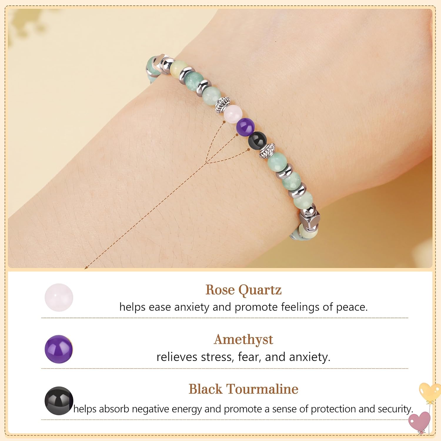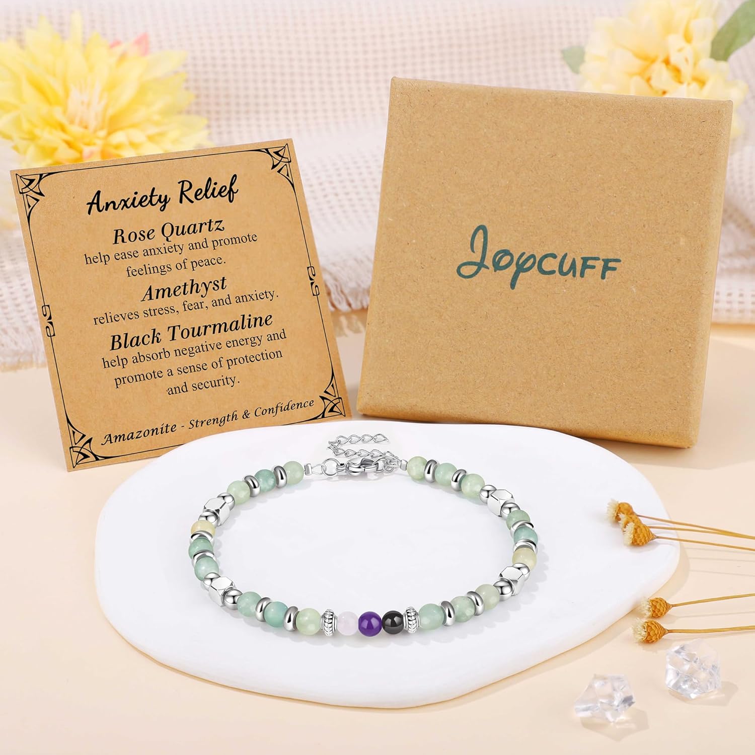 Anxiety Relief Gifts Rose Quartz help ease anxiety and promote feelings of peace.Amethyst relieves stress, fear, and anxiety.Black Tourmaline help absorb negative energy and promote a sense of protection and security.